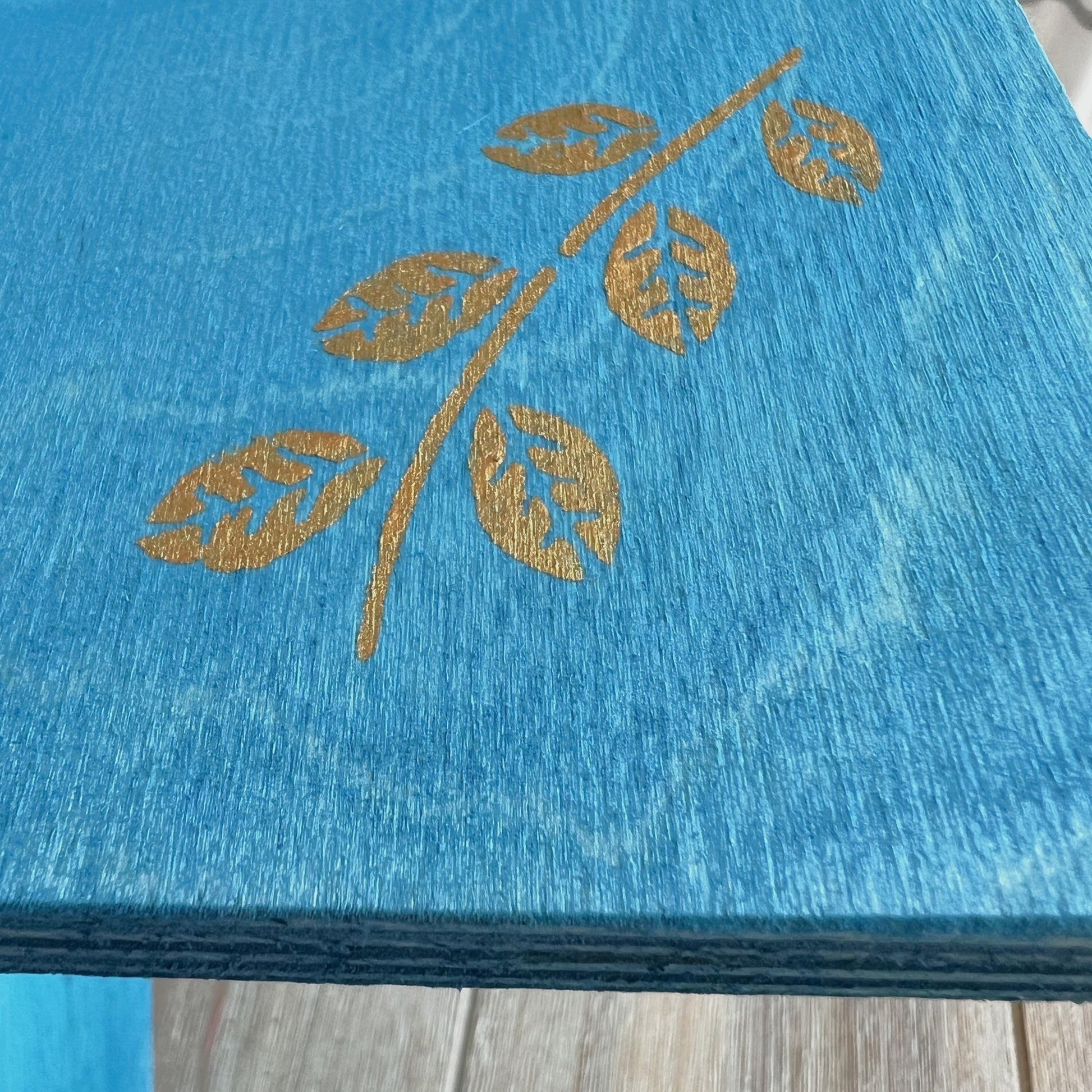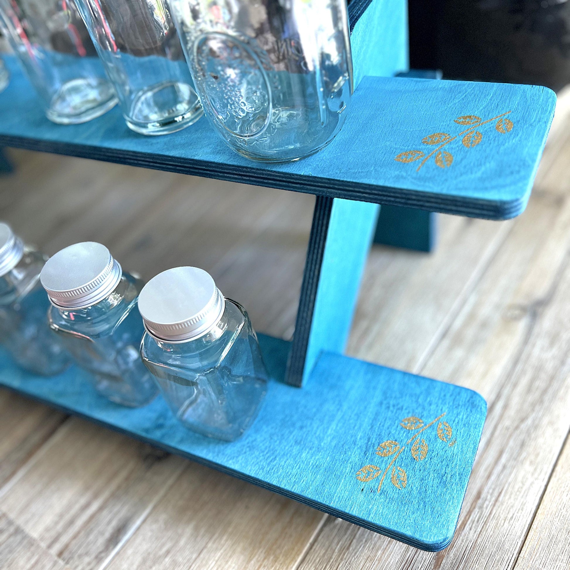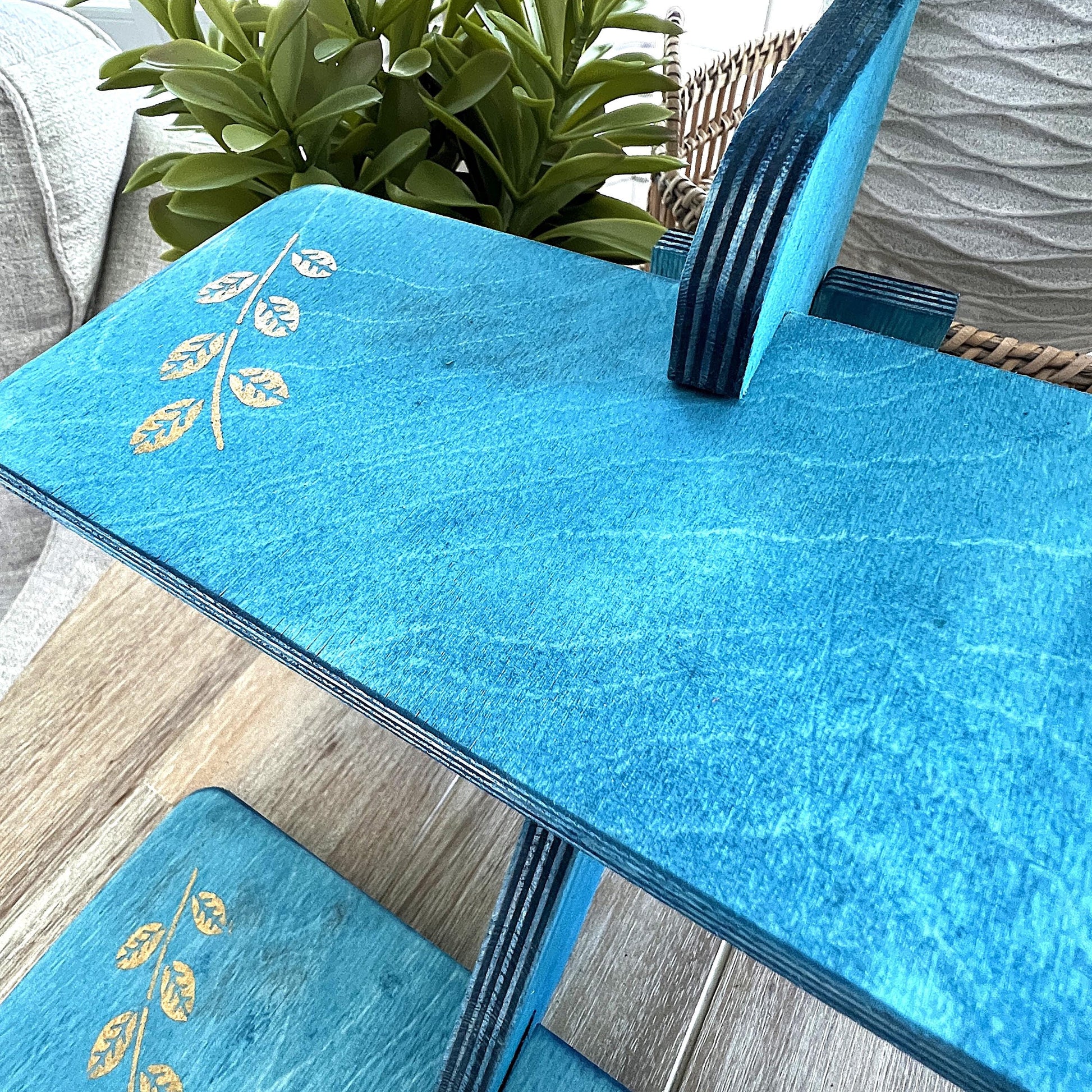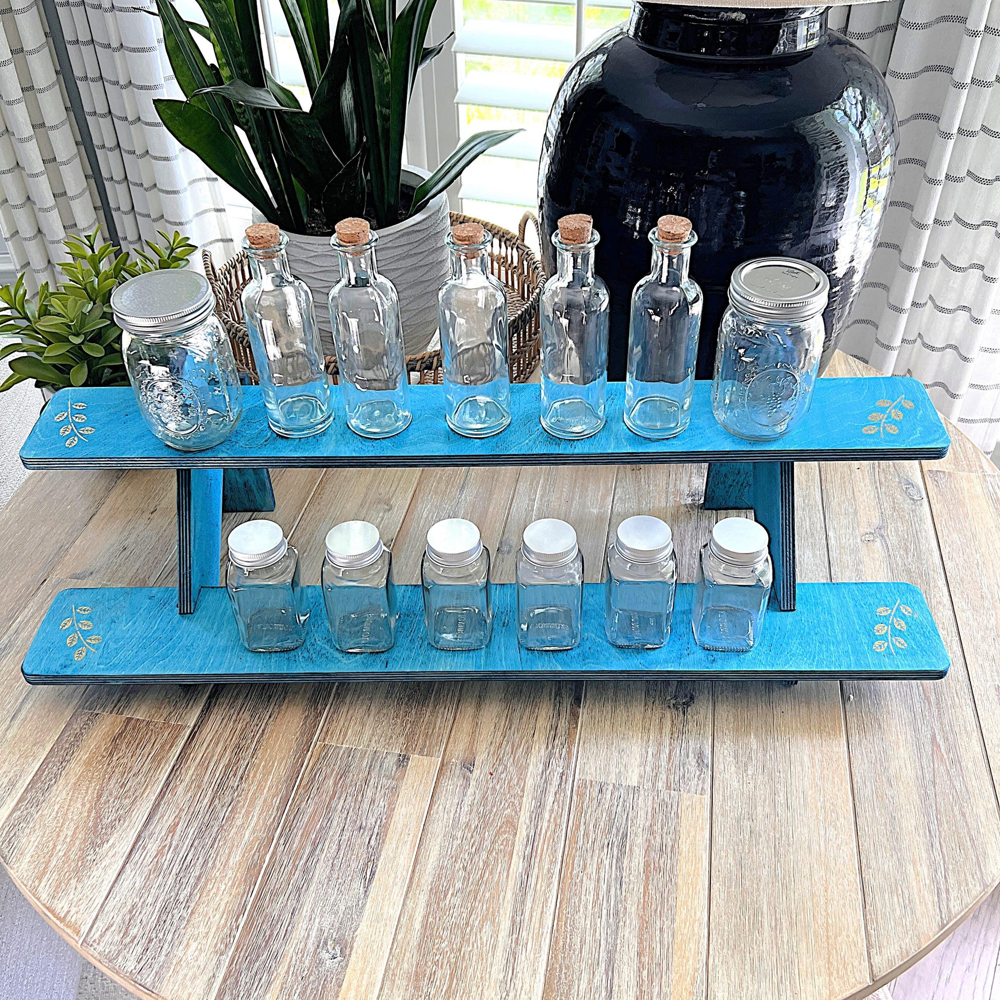 This 2-tier display has two coats of a beautiful color wash that gives an incredible highlight to the wood grains and one coat of sealing polyurethane. The accent stencil is gold acrylic paint. This could bring a beautiful change to your product setup and stands out from the typcial plain wood stands found everywhere.