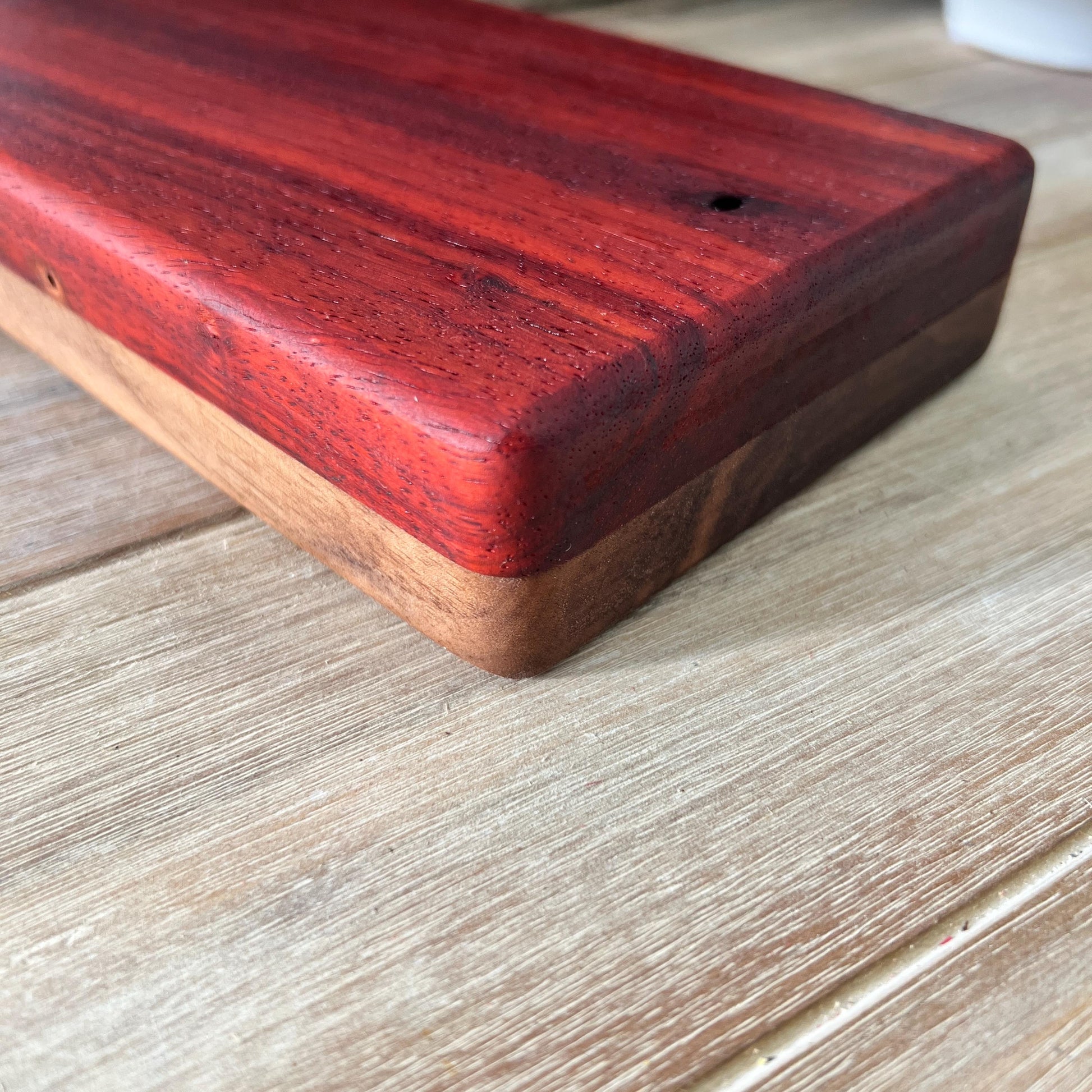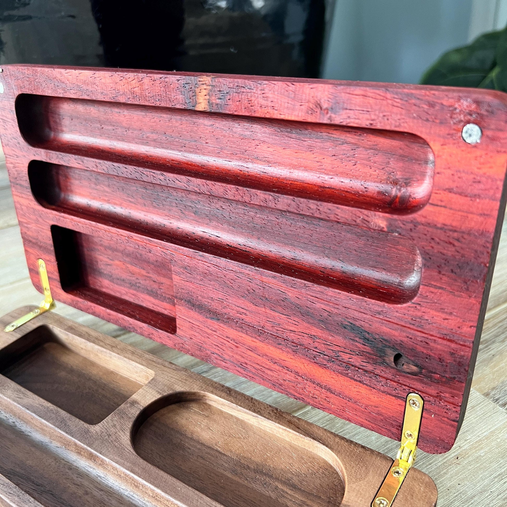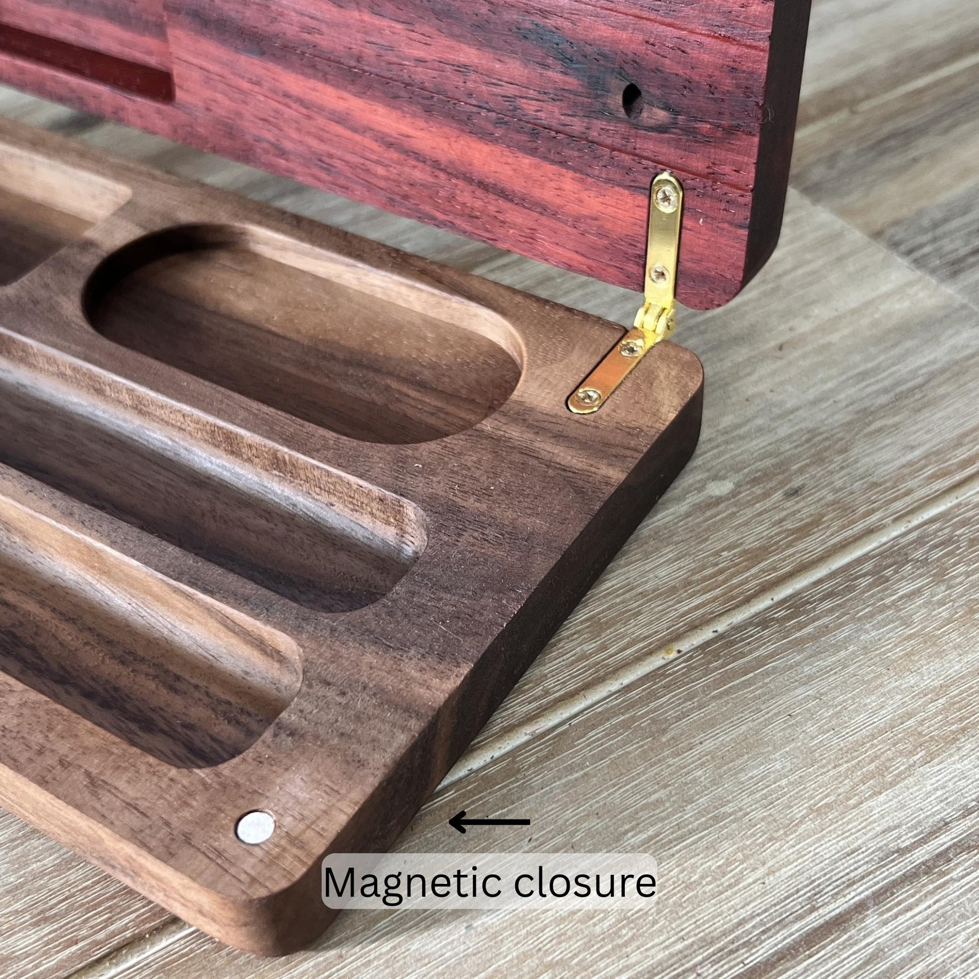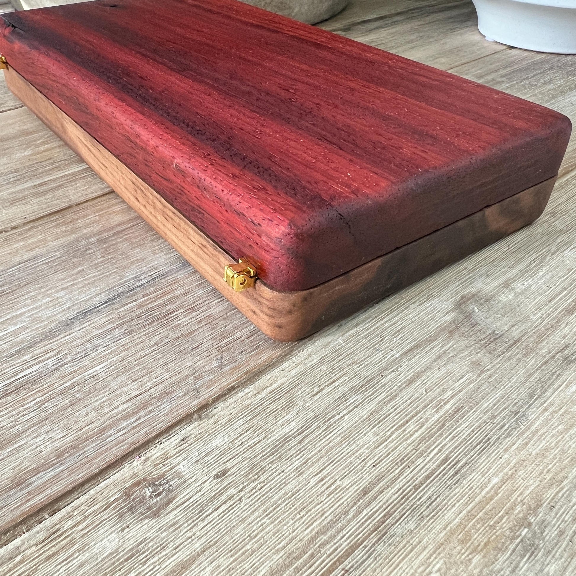 An unforgettable stunning travel case for any cigar enthusiast. Created with solid Paduk, magnetic closures and gold accent hinges.