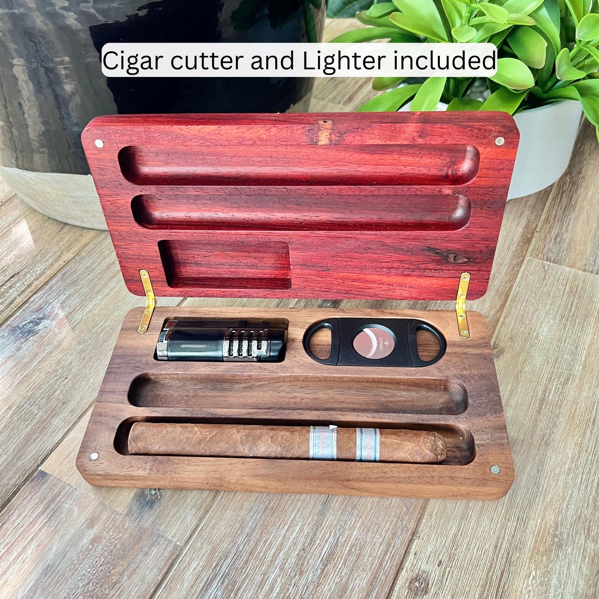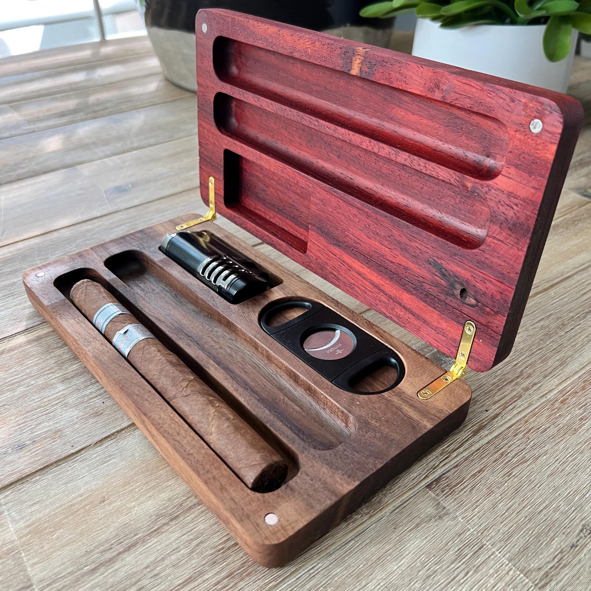 Exotic Paduk Wood Cigar Case with Lighter and Cutter
