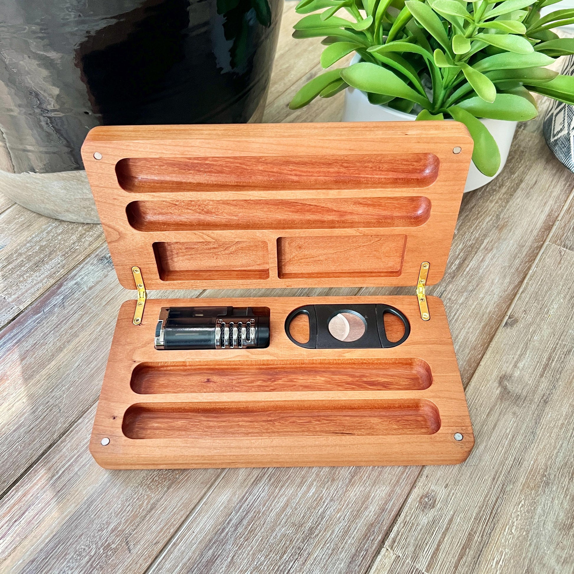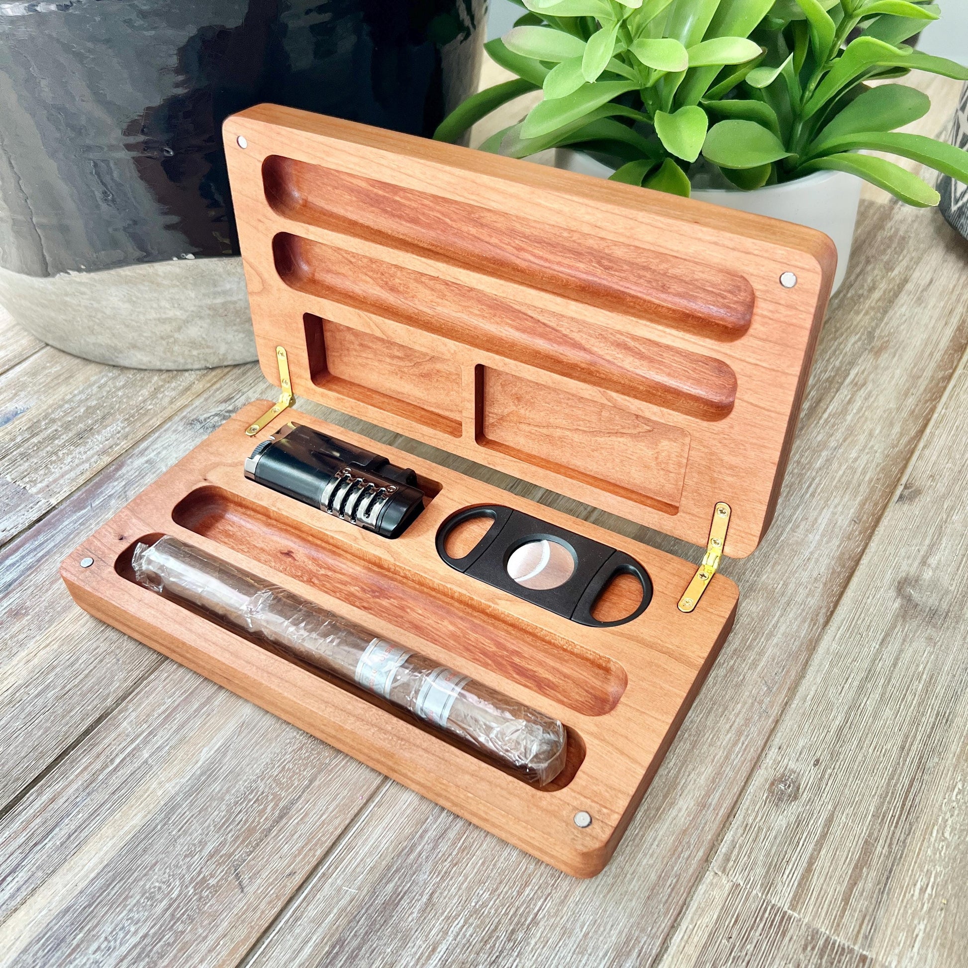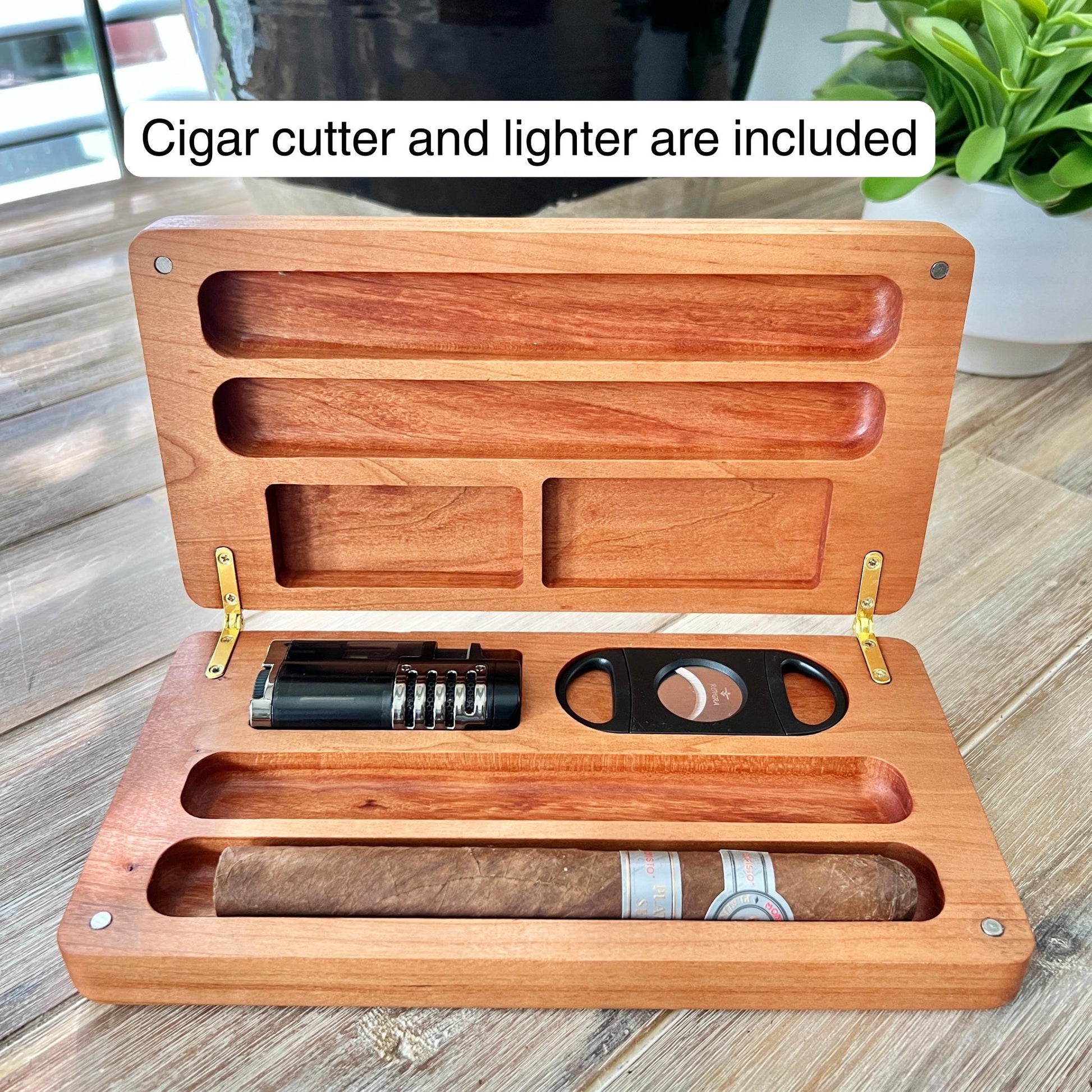 Luxury Cherry Wood Cigar Case with Lighter and Cutter Included