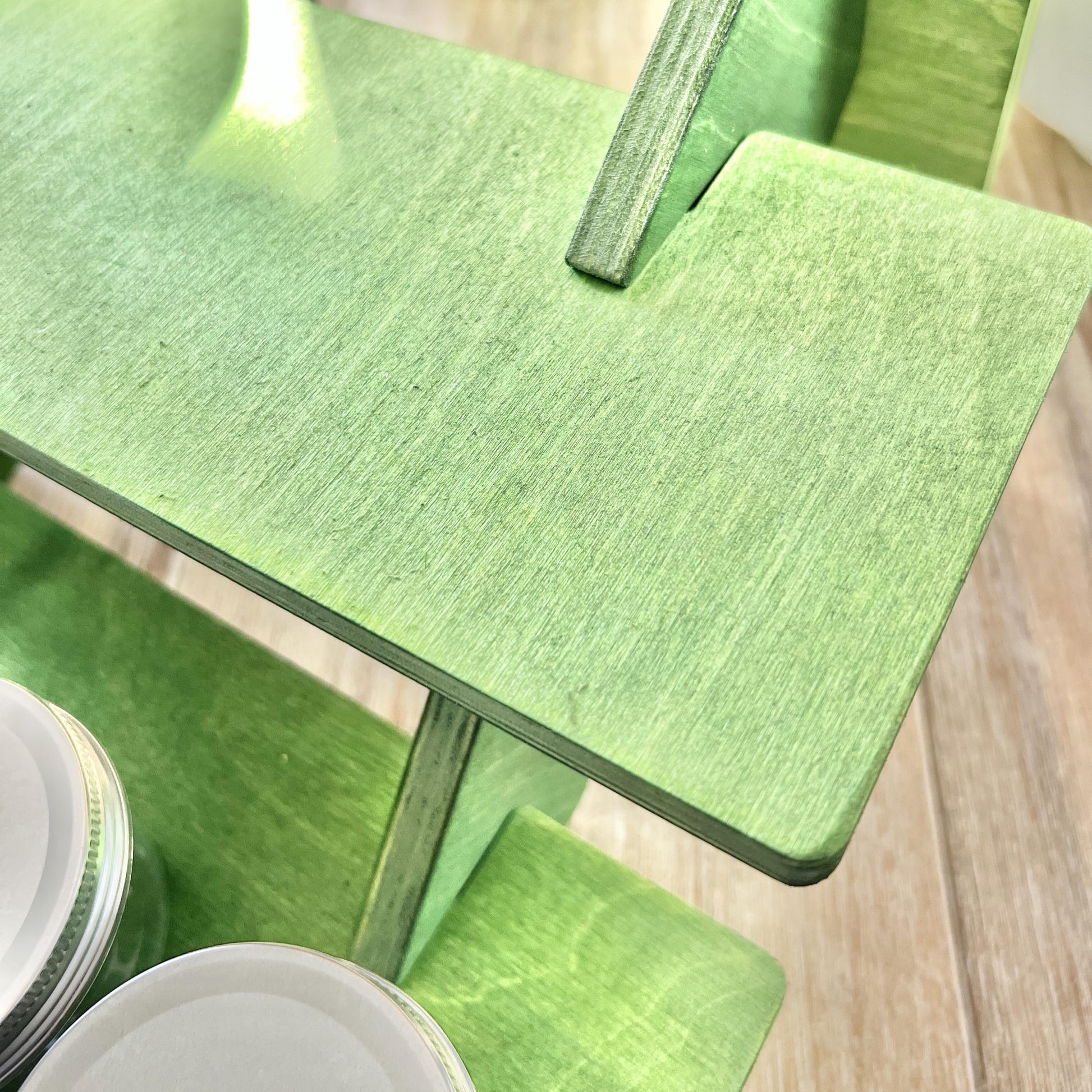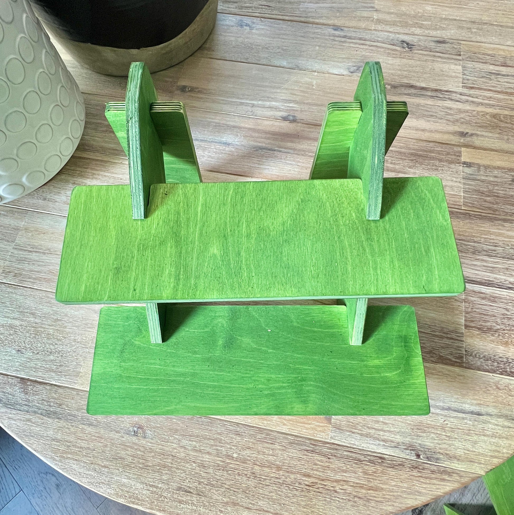 Offering 2 stands created using a combination of alcohol ink and waterbased color wash to achieve the gorgeous green color, and 2 coats of polyurethane. Definitely a welcome change from all the plain wood stands found everywhere and it can be a great way to help your products stand out from other booths.
